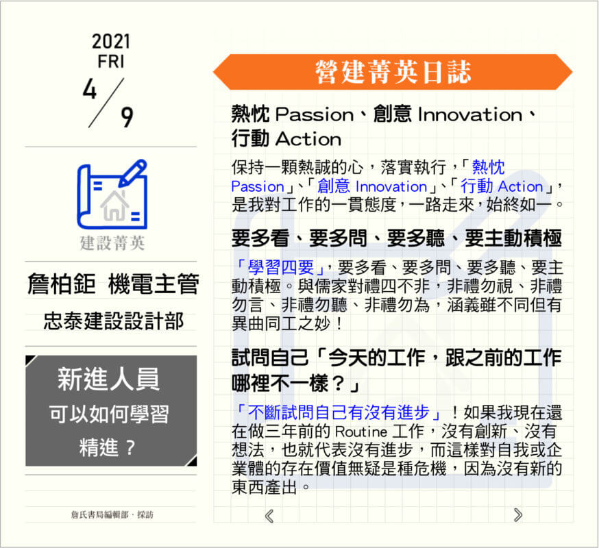 【今日菁英】忠泰建設設計部‧詹柏鉅機電主管─今天的工作,跟之前的工作哪裡不一樣? 接力分享的菁英是…… 潘冀聯合建築師事務所 / 張曉鳴 主持建築師即將分享 建國工程股份有限公司統包工程部 / 林志成 協理即將分享 瀏覽總數: 484 詹氏粉絲團 營建菁英日誌 │2021.4.8│忠泰建設設計部詹柏鉅機電主管 營建菁英日誌 │2021.4.12│忠泰建設設計部詹柏鉅機電主管